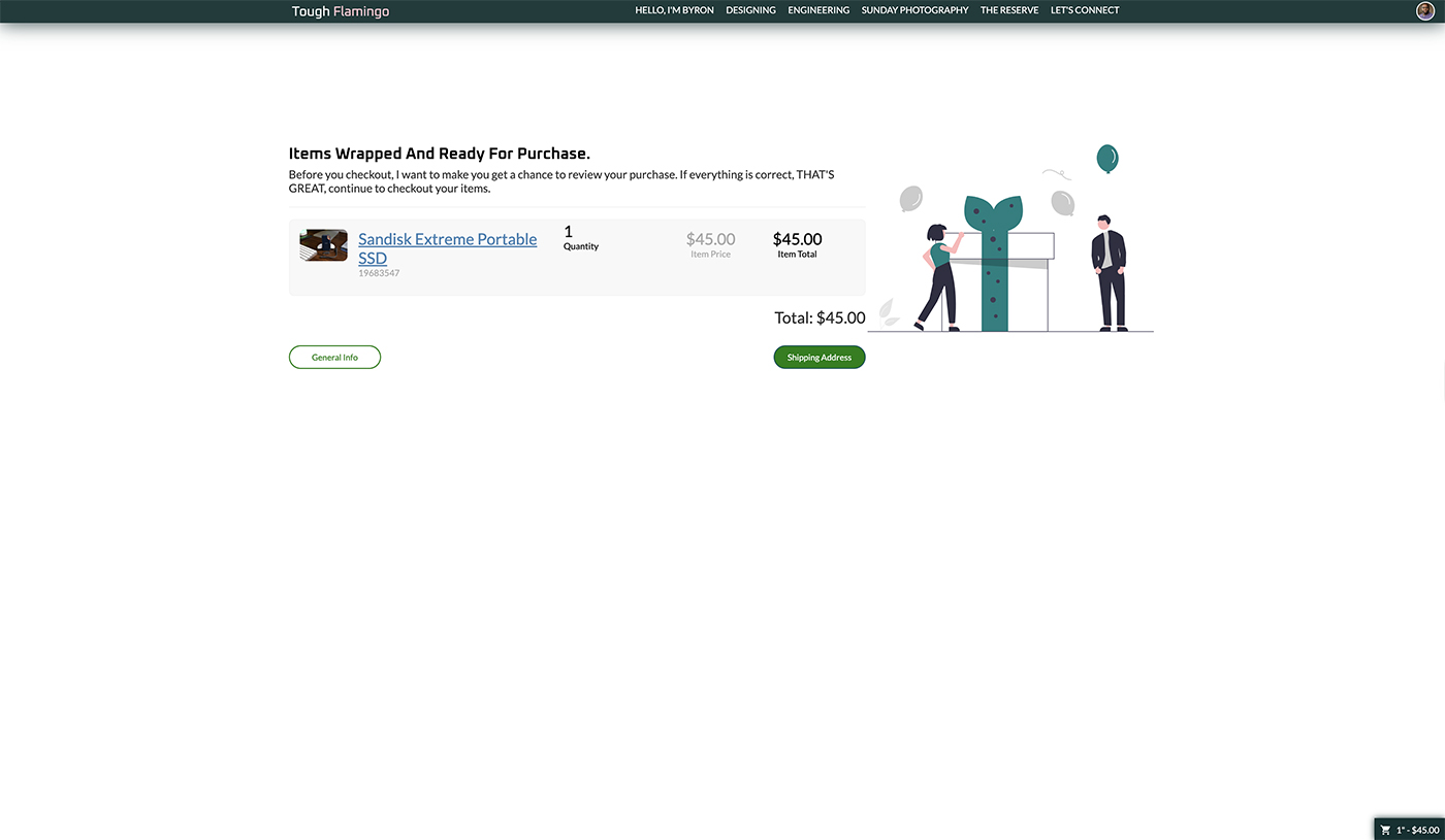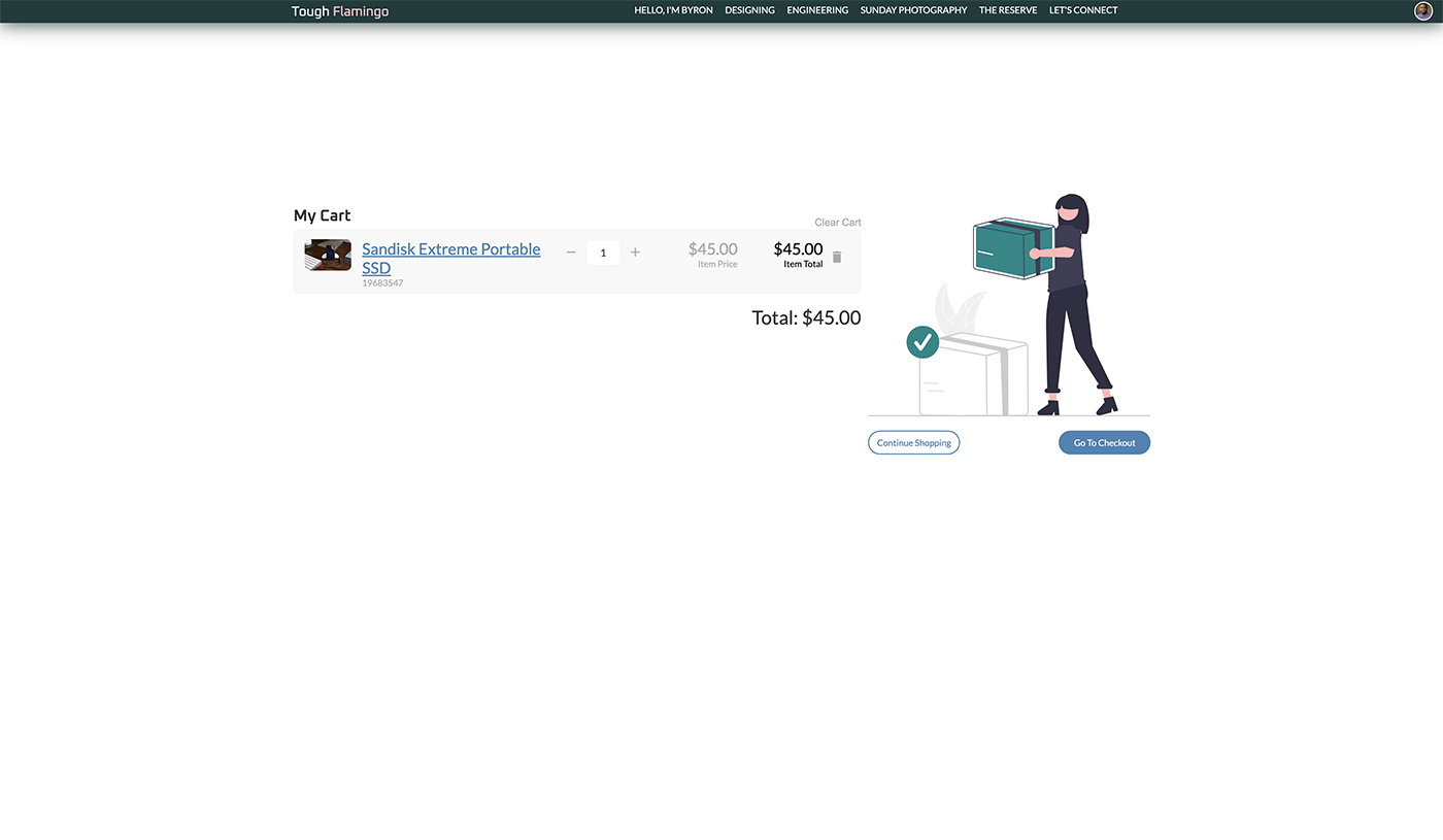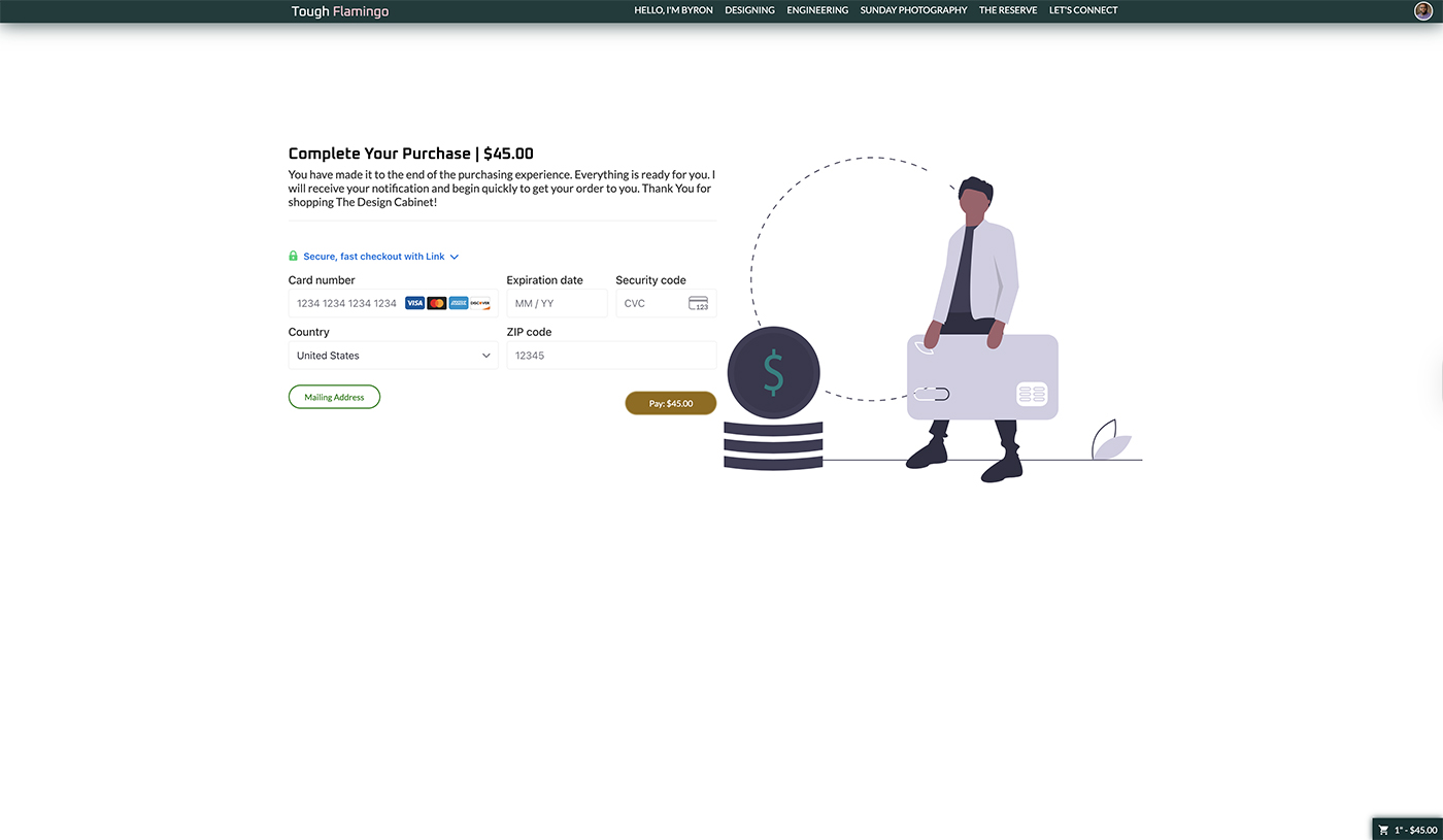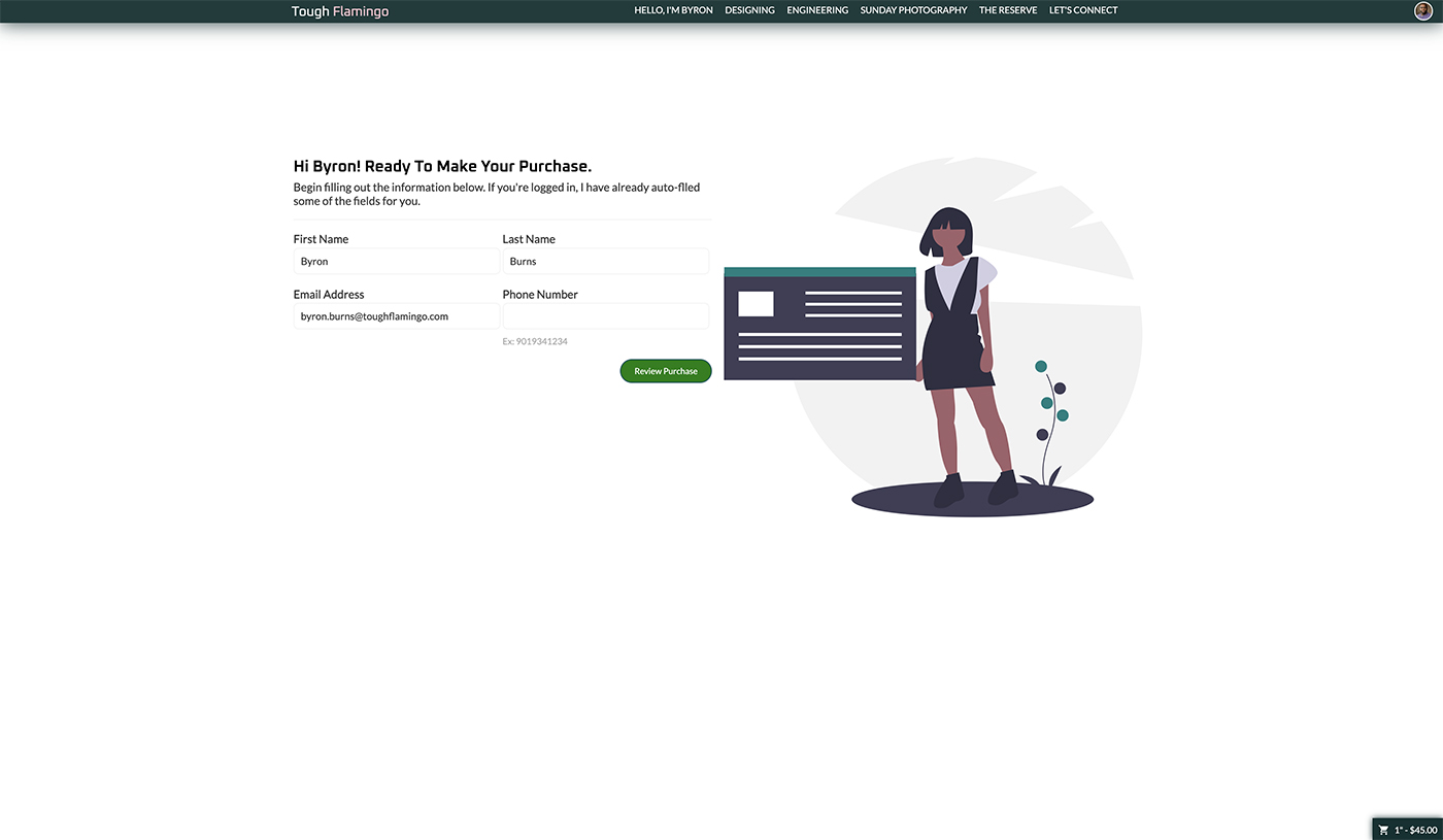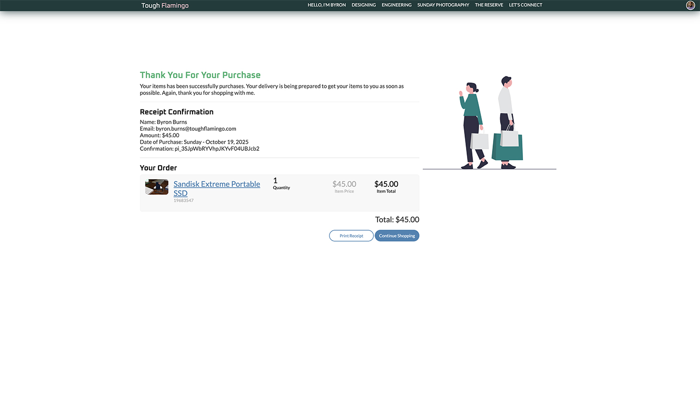 The shopping cart can be accessed at the cart view level. The view allows the customer to see and update the cart. The functionalities include: removing items from the cart, clearing the entire cart, and changing the quantity. The cart will adjust the price in real time so that the customer can be aware of the changes. The cart also provides details on the item price and line total, calculating the total based on the quantity. To help with error validations, the quantity will prevent the customer from entering a zero quantity or exceeding the amount available in stock.Once the customer is ready to check out, they can provide their information through the [Reserve] system, using Stripe as the PCI-compliant payment processor for transactions. I will receive notifications and prepare to ship the item(s). The customers will receive a notification that their payment has been successfully processed. An email notification will also be sent to the email address the customer provided.